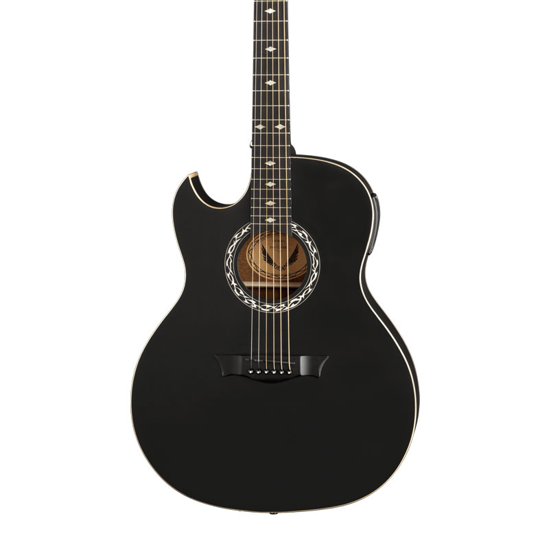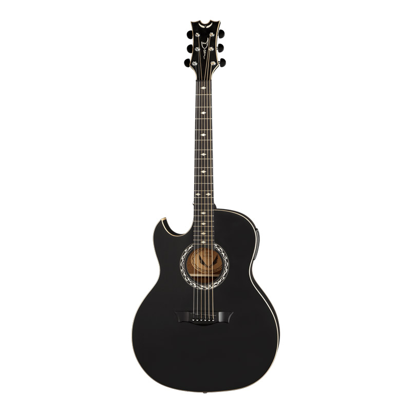 The Dean Exhibition Acoustic-Electric Guitar is designed to be a perfect companion onstage. Made with mahogany, the thin body of the Exhibition adds comfort while helping to reduce feedback when plugged in. The slim D-shaped profile of the set mahogany neck is extremely comfortable for electric guitarists and features a 24-1/4" scale. Appointments include a smooth ebony fingerboard, pearl diamond inlays, black NuBone nut & saddle, Grover tuners, and DMT G05 electronics with built in tuner.