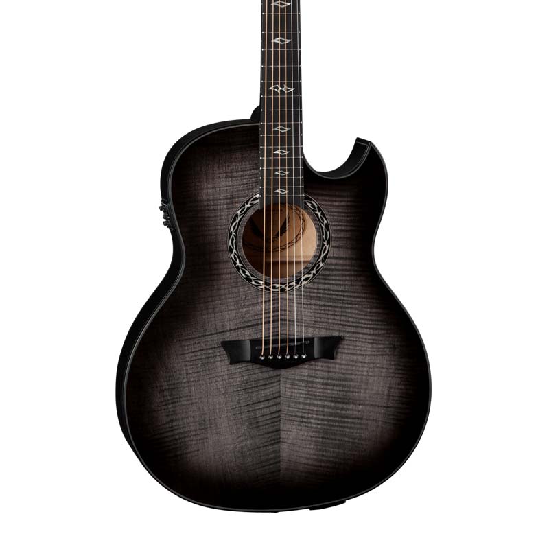 Made with mahogany and a flame maple top, the thin body of the Exhibition adds comfort while helping to reduce feedback when plugged in. The slim D-shaped profile of the set mahogany neck is extremely comfortable for electric guitarists and features a 24-1/4" scale. Appointments include a smooth ebony fingerboard, pearl diamond inlays, black NuBone nut & saddle, Grover tuners, and a Fishman Presys II USB Preamp with Tuner.